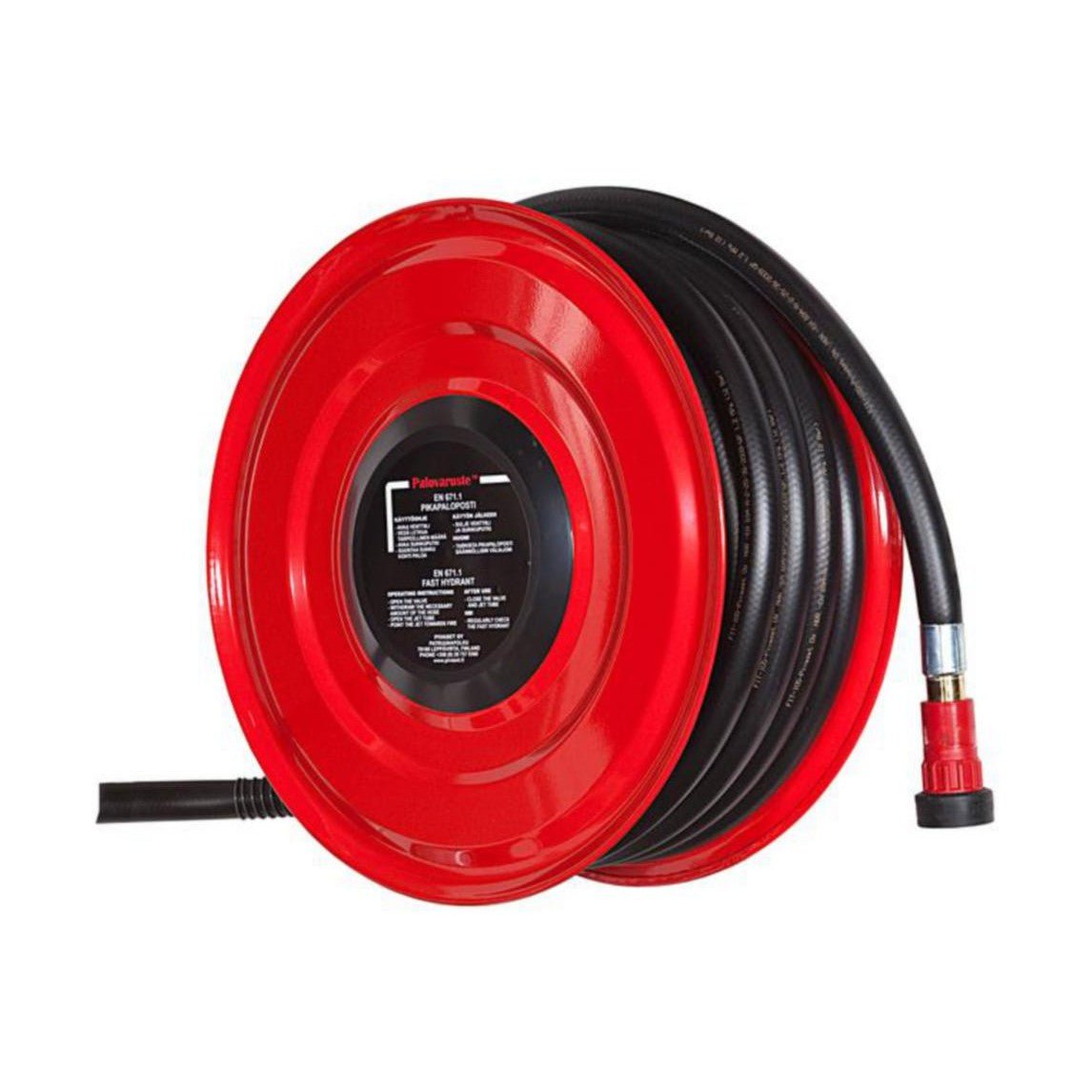 Pikapalopostikaappeihin tarkoitettu vaihtokela. Sisältää palopostiletkun ja suora-/sumusuihkuputken sekä 1" yhdysletkun veden syöttöä varten.