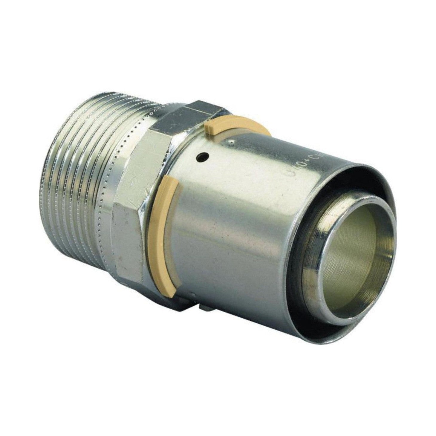 S-Press-puristusliitin Uponor-komposiittiputkelle. Liittimessä on värikoodi koon tunnistamiseksi ja siinä on puristusilmaisin sekä puristusholkki tarkastusikkunalla. Puristamaton liitin vuotaa painekokeessa. Materiaali DR-messinkiä.