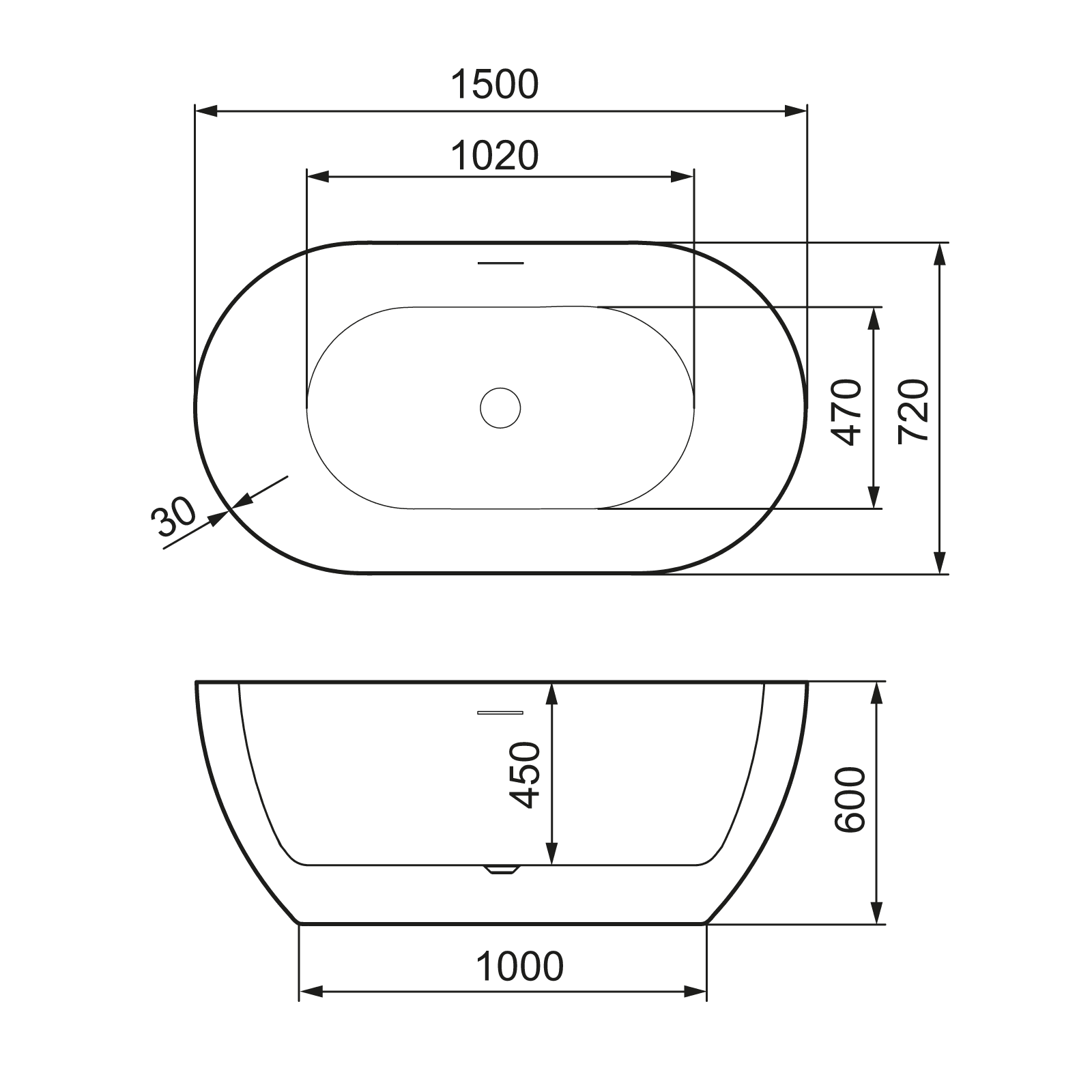 Symmetrisen kylpyammeen tyhjennysaukko on keskellä ja reuna 3 cm paksuinen. Kokovaihtoehtoja on kaksi ja ylivuotoaukko suunniteltiin minimoimaan veden aiheuttama laikkuuntuminen.