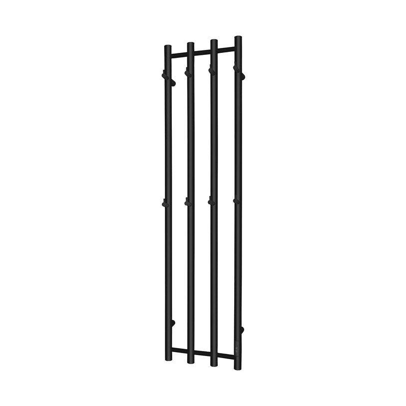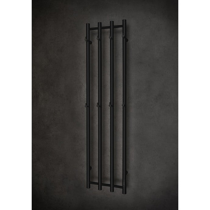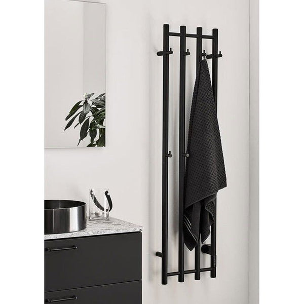 Tyylipuhdas sähköpyyhekuivain pyöreillä pystyputkilla, Kaksi kokoa. Väreinä ruostumaton kiiltävä ja matta musta. Integroidut koukut antavat tilaa useille pyyhkeille. Sisäänrakennettu ajastin säästää sähköä ja pyyhekuivaimen voi asentaa myös piiloitetulla sähköliitännällä sähköasentajan toimesta. IP44.