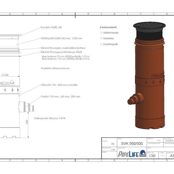 Pipelife sadevesikaivo SVK560 on tarkoitettu sade-, sulamis- ja valumisvesien keräämiseen. Sadevesikaivoa käytetään tarkastuskaivona sekä hulevesikaivona. Sadevesikaivon voi lyhentää tai jatkaa tarvittaessa ja se on helppo asentaa. Tässä sadevesikaivossa on ankkuroituva rakenne eikä se vaadi syvää kaivantoa.