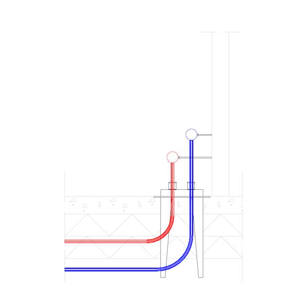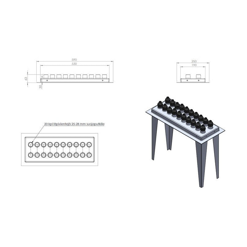 Jakotukkien suojakaukalo, joka toimii asennuslevynä ja korokevaluna. Kaukalossa 20 kpl läpivientejä 25-28 mm suojaputkelle.