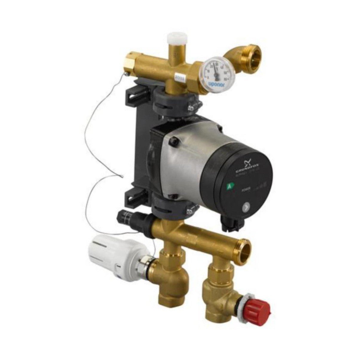 Vesikiertoisen lattialämmityksen sekoitusryhmä, joka on varustettu menoveden lämpötilan säädöllä. Pumpun teho riittää n. 170 m² pinta-alalle.